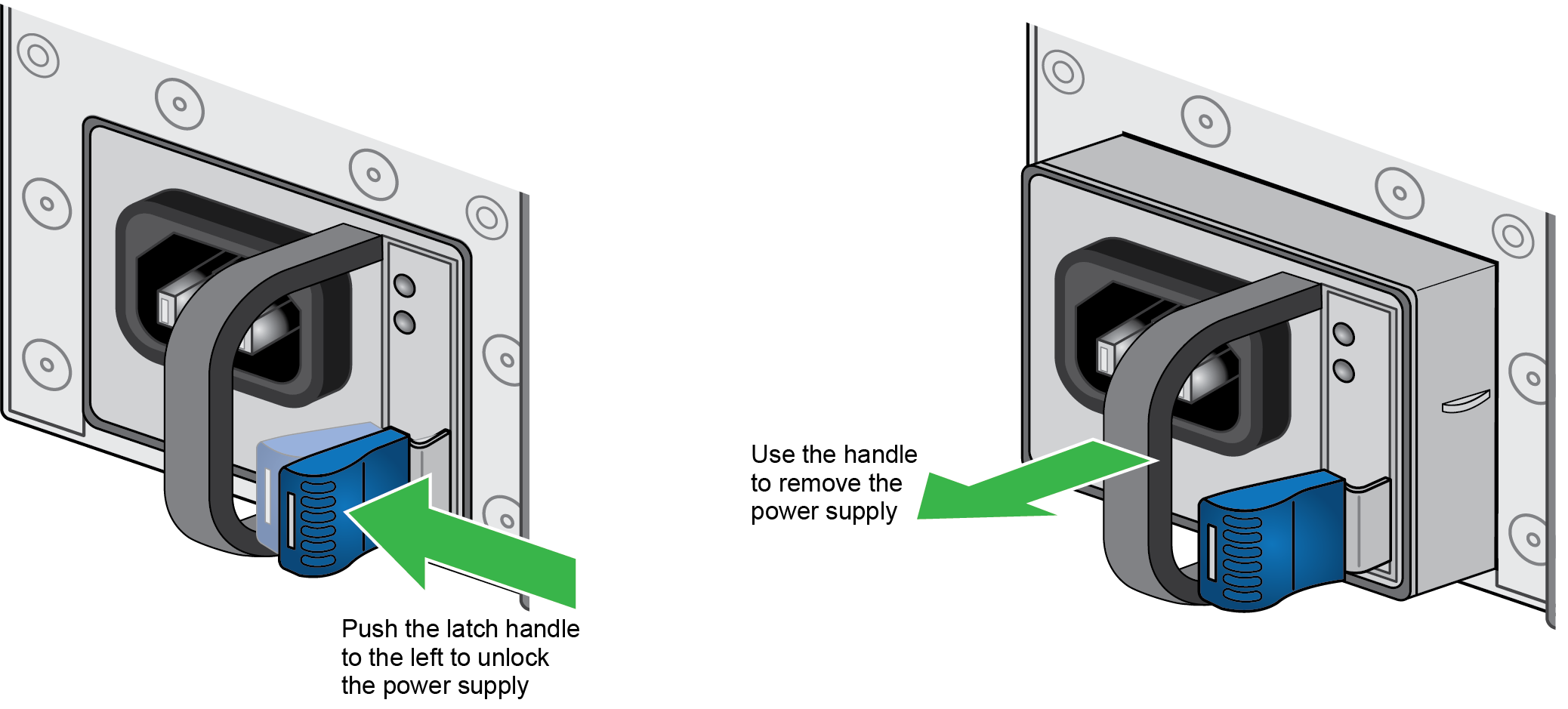 - Put the provided ESD wrist strap on your wrist ensuring that the metal contact is touching your skin. Then attach (snap) one end of the ground cable to the wrist strap and remove the alligator clip from the banana clip on the other end of the ESD grounding cable. Plug the banana clip end into one of the ESD ports located on the back of the appliance before handling ESD sensitive hardware. For details on the ESD port location, see PA-5400 Series Back Panel.Locate the failed power supply by viewing the system logs or by viewing the LED on the front of the power supply. A red LED indicates a failed power supply. For details on the power supply LEDs, see Interpret the PA-5400 Series Firewall Power Supply LEDs.Shut off power to the failed power supply.(AC only) Unplug and remove the power cord (leaving the cord in place can cause arcing inside the appliance).(DC only) Power off the DC power source that is connected to the failed DC power supply.Facing the rear side of the appliance, push the power supply latch handle to the left to disengage the latch from the appliance. With the latch still pushed to the left, pull on the metal handle to slide the power supply out.