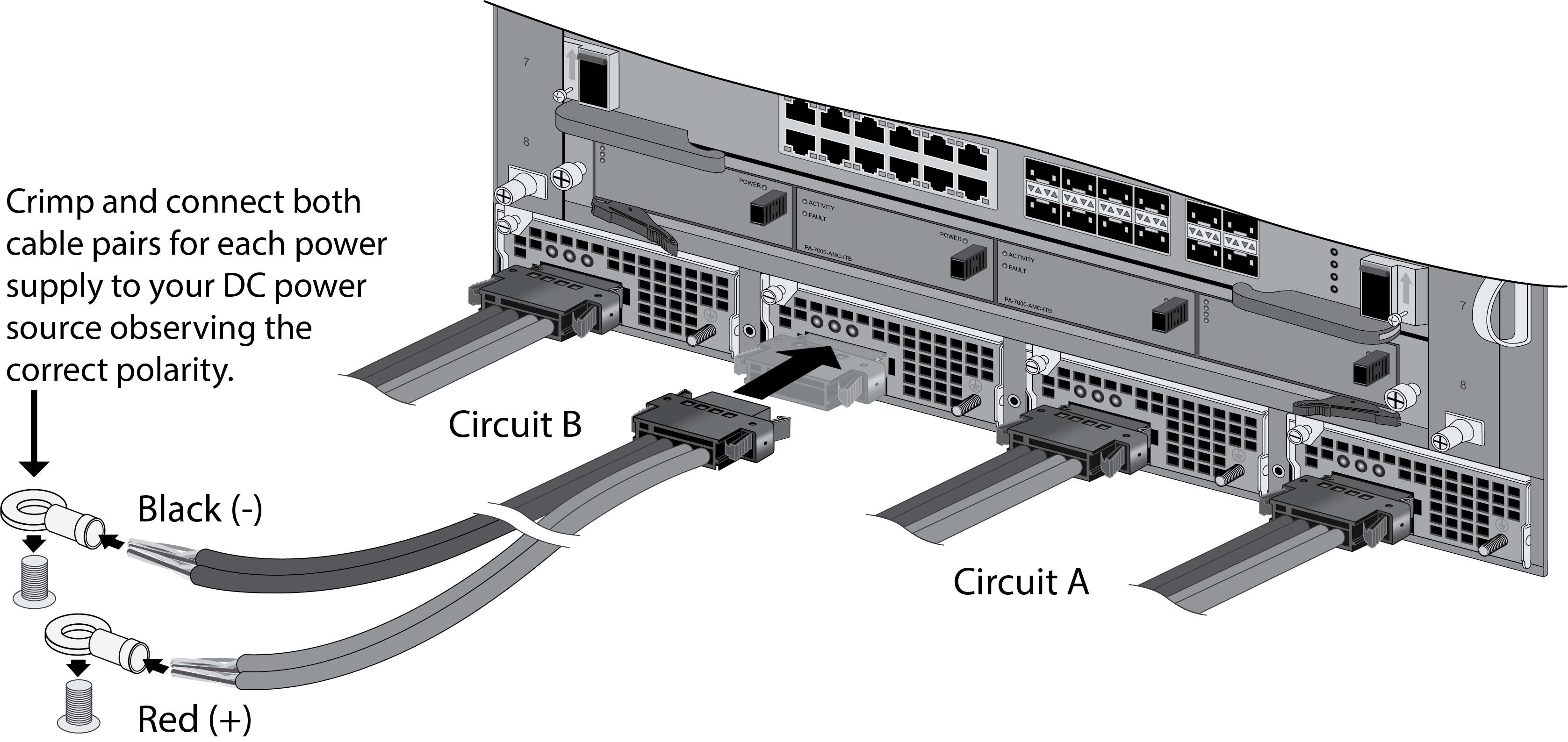 Power off your DC power feed.Connect each of the four DC power supplies to a -48VDC power source using the provided DC power cables.- Crimp the bare wire ends of the cables using lugs (not included) designed for your DC power source. Each cable has two red (positive) and two black (negative) wires. Crimp the two black wires together and connect to your DC negative terminal and then crimp the two red wires together and connect to the positive terminal. Do this for each of the four power supplies, ensuring that the first two power supplies on the left are connected to one power circuit breaker and the second pair on the right is connected to a different circuit breaker. This ensures power redundancy and allows for planned electrical circuit maintenance.Connect the other ends of the DC cables to the front of the DC power supplies by pushing the plastic connector into the DC power supply until it clicks into place. Ensure that you connect each pair of power supplies to a different circuit breaker.When cabling the DC power supply to your power source, ensure that you route the cable in such a way that it does not put pressure on the plastic clips located at the front of the DC power supplies. It is best to route the cables first and then plug the cables into the power supplies.Confirm that all front slot cards are properly inserted.After each DC cable is securely connected, power on the DC power source and the chassis will power on.