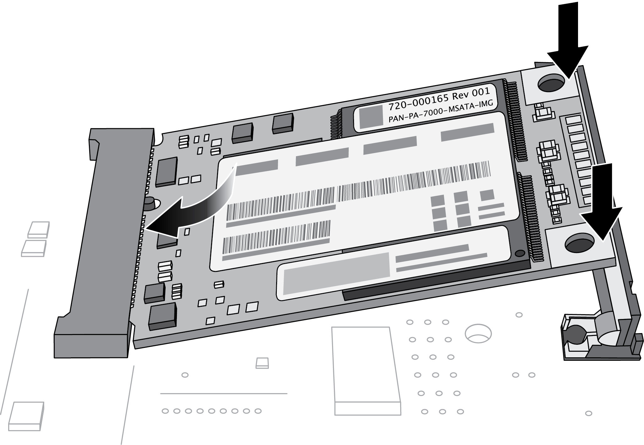 Carefully place the new mSATA into the socket. Ensure that the label displaying the Palo Alto Networks SKU and bar codes is facing up. Press the mSATA down until it clicks into place and is secured by both clips.