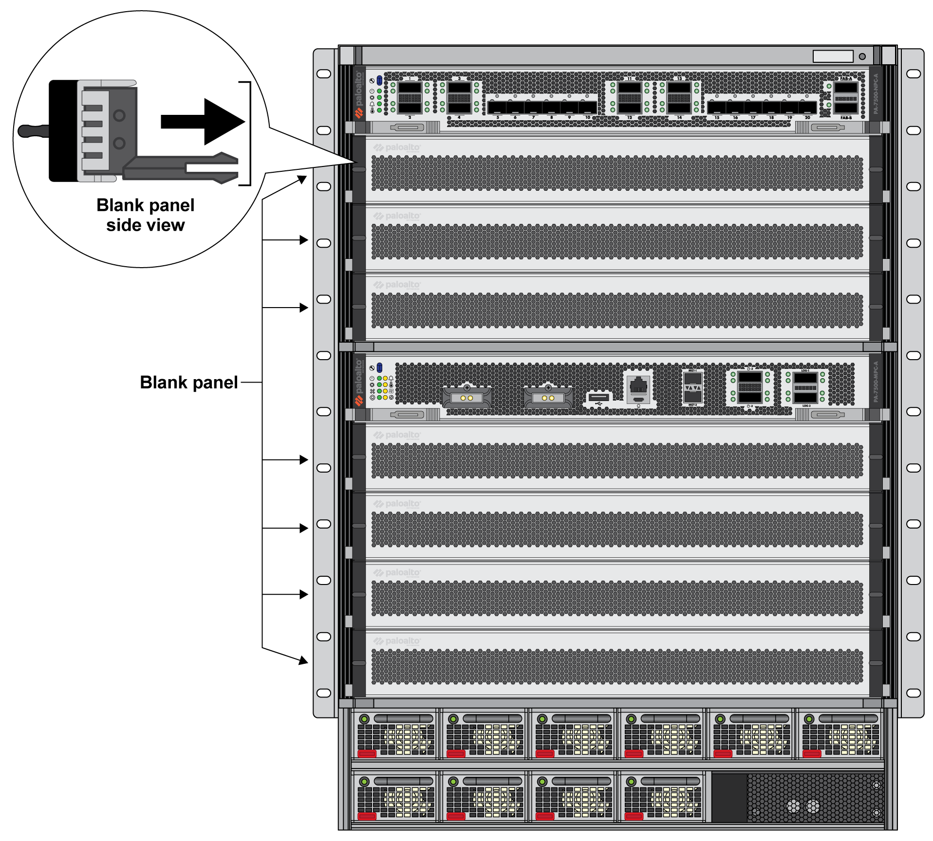 Install blanks in all unused slots to help maintain chassis air flow.- (MPC, NPC, and DPC) Insert the blank into the front slot. Ensure that the two prongs on either side of the blank fit within the ridges on the inside of the chassis.