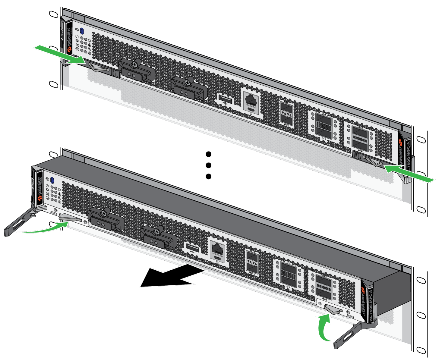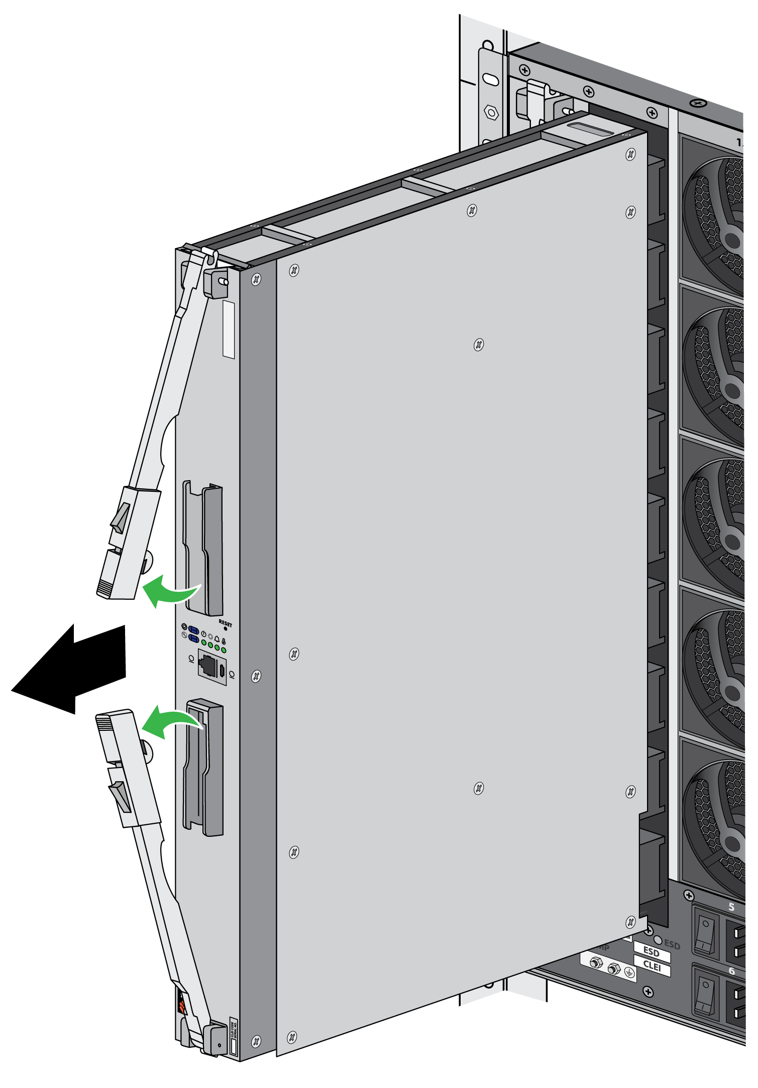 - (MPC, NPC, and DPC) Push the ejector tabs on the card towards the center, prompting a click. This will cause ejector handles on the front of the card to rotate outward and unlock the card.