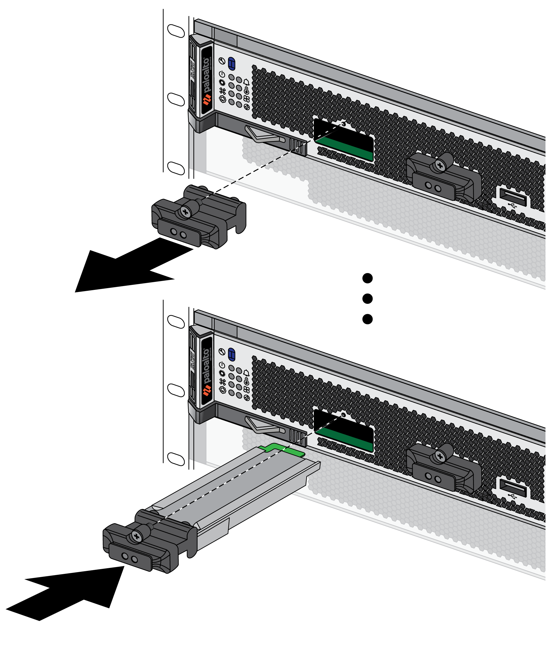 admin@PA-7500> show system disk detailsRemove the failed drive by running the following command:admin@PA-7500> request system disk remove <name of disk>Attach an ESD strap to your wrist and plug the other end in to the ESD port location on the chassis.Loosen the retaining screw on the logging drive blank cover while gently pulling on the pull tab. Proceed until the logging drive blank cover can be pulled out from the MPC faceplate.Remove the failed logging drive from the opening in the MPC faceplate.Insert the replacement logging drive. Align the retainer screw with the threaded hole in the MPC faceplate.