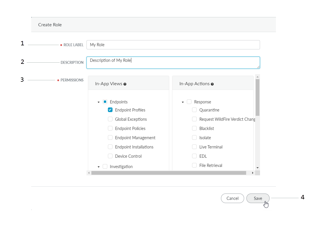 - Enter a unique ROLE LABEL to identify the role. Duplicate labels do not work.(Optional) Enter a DESCRIPTION.Select the PERMISSIONS that you want users with this role to have.Save your role definition.Verify that you successfully created your role.