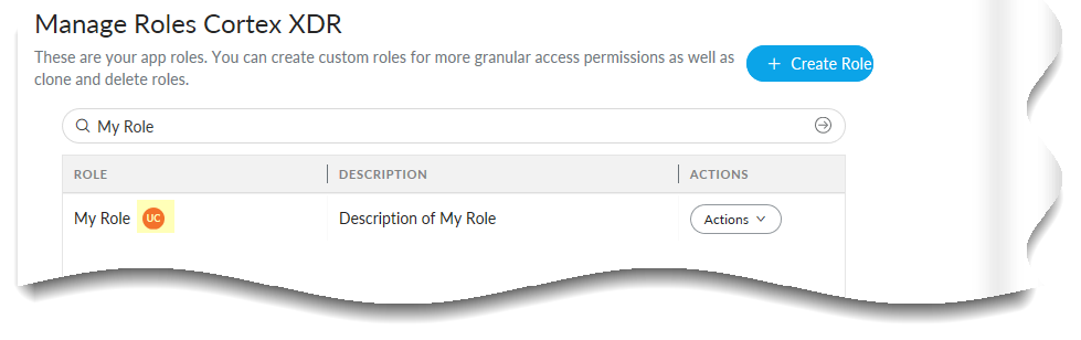 - On the Manage Roles page for the app , enter the name of your role in the search bar.Verify that your role appears.UC should appear next to the name of your role to indicate that it is user created.To assign your new role, select it when you assign roles for app instances.