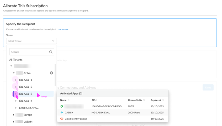 A subscription gets allocated on a tenant or a sub-tenant. This step is for choosing a tenant where you want to allocate a license, not for building a complete tenant hierarchy. You can create only a tenant and subtenant here, and you can choose to allocate a license to that subtenant.After activation, you can build out your tenant hierarchy as needed through tenant management. You can create your tenant hierarchy to reflect your existing organizational structure. You can also consider identity and access inheritance when creating the hierarchy, in addition to tenant hierarchy limits.Select Done.Choose the data ingestion Region, which is the region where the cloud logging service is receiving data from firewalls.Strata Logging Service- If you are using Device Security that doesn't require Strata Logging Service, this sends data logs to a cloud logging service that streams them directly to Device Security without storing them in a data lake. Skip to the App Subdomain step.