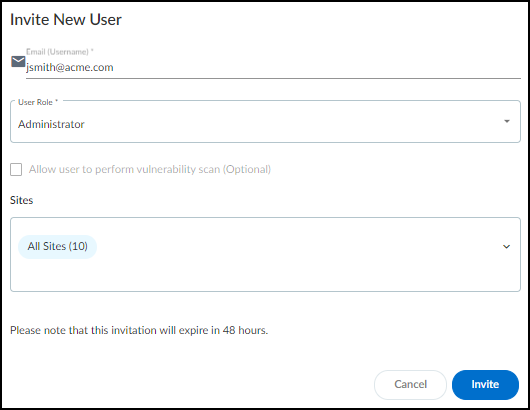 - Enter an email address, choose a role (Owner, Administrator, or Read only), specify which sites the user can access, and then Invite.