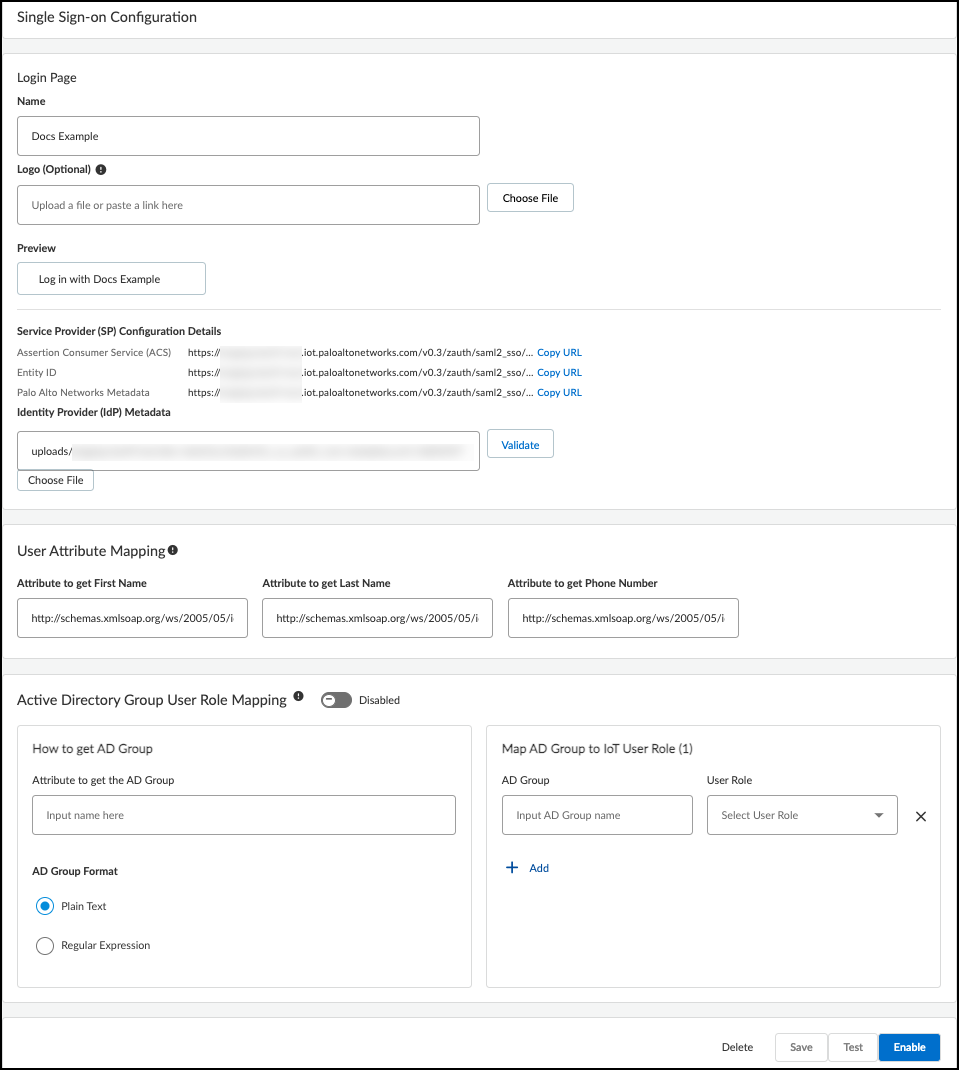 - Configure your IdP with the following URLs, replacing the tenant-id variable with your own tenant ID, which is the first part of your Device Security portal URL:https://tenant-id.iot.paloaltonetworks.com/loginDepending on how you configure your IdP, either point it to the Device Security metadata URL to retrieve all the necessary data or enter the information separately.
