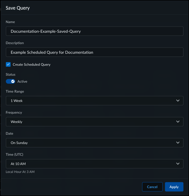 Click Apply to save the query and return to the Query Library.Verify that your saved query appears in the Query Library and the Scheduled column correctly reflects if it is a scheduled query.Modify a Saved or Scheduled Query