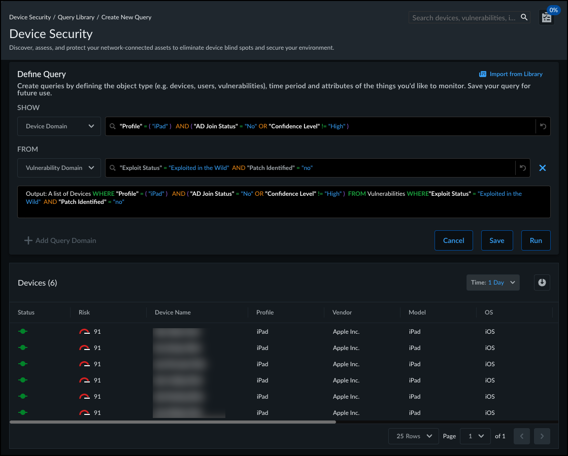 - Select an attribute to query by.You can select an attribute from the drop-down that appears when you select the Input Query… field. Before you start typing, this list only contains common attributes.If you start typing, the list refines to attributes that match your input, including displaying third-party attributes.Select a logical operator for the attribute value you want to search for or against.The drop-down list shows which logical operators are valid for the selected attribute.Select the attribute value that you want to search for or against.The drop-down list shows which attribute values you can select, based on values seen for your devices, alerts, or vulnerabilities.Optional Define additional attributes and attribute values for querying, using valid connecting operators.Optional If you selected Device Domain as your primary domain, add a secondary domain and define your query for the secondary domain.You can select Alert Domain or Vulnerability Domain as a secondary domain. Define the query for the secondary domain the same way you defined the query for your primary domain, with attributes and operators specific to the secondary domain.Validate your syntax using the output box to review your complete query.The output box updates as you build out your criteria. It shows your complete query definition, including appending the secondary domain query if you added one. The output box checks only for valid syntax and displays an error if the query syntax is invalid. This can happen for a variety of reasons, such as an empty or incomplete query, or incompatible operators for the attributes.Run the query to view the results.When you Run the query, for the first time, a table appears at the bottom of the page. The table displays results from the past day that match your criteria. You can change the time filter to search for all matching devices from the past hour, up to the past year.