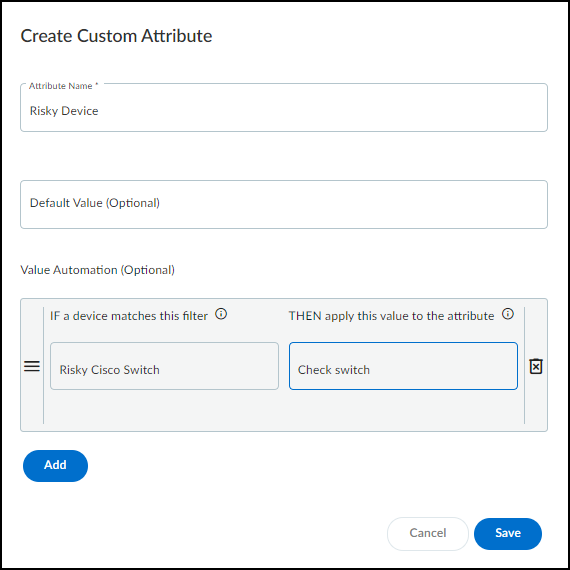 - Enter the following in the Create Custom Attribute pop-up panel that appears:Attribute Name: Enter a name for the custom attribute. It cannot contain special characters and it cannot be longer than 50 characters.Default Value (Optional): Enter a value for Device Security to apply by default to all the devices in your inventory. If you don’t include a default value, Device Security will enter N/A in the field for this attribute.Value Automation (Optional): Add an IF/THEN conditional statement to determine when a value is applied to the device attribute. Choose a previously defined filter for the IF a device matches this filter field and then enter a value in the THEN apply this value to the attribute field. You can add more IF/THEN statements (up to five). The logical relationship between them is “or” and their order is important because Device Security checks the conditions from the top down and will apply the value of the first match it finds.