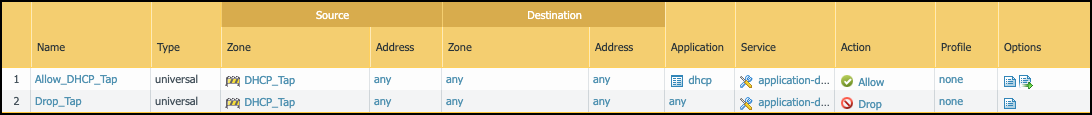 first policy rule matches DHCP traffic and uses the same log forwarding