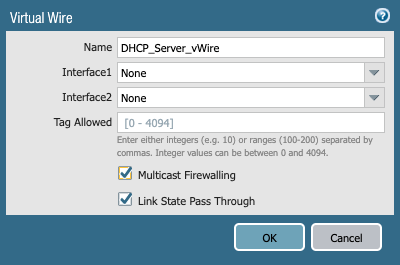 - Configure a Virtual Wire interface, complete with zones.The configuration of the Virtual Wire object must include multicast firewalling: