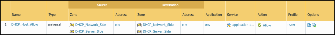 - The “DHCP_Host_Allow” policy rule allows everything else to and from the DHCP server and does not forward logs for traffic matches.