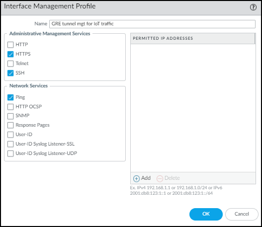 - Click OK to save the new interface management profile and then click OK again to save the Ethernet interface configuration.