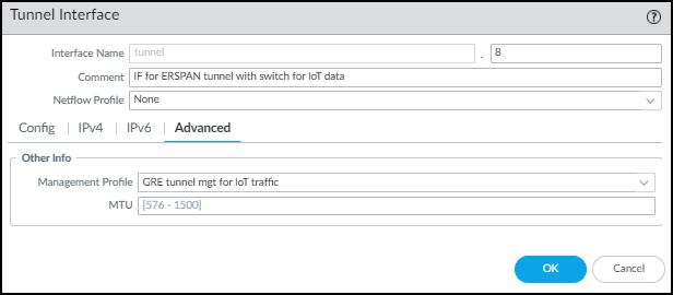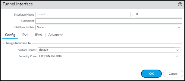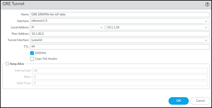 - Enter the following and leave the other settings at their default values:Name: Enter a name for the GRE tunnel; for example, GRE-ESPAN-for-IoT-dataInterface: Choose the Layer 3 interface you configured for GRE tunnel termination.Local Address: Choose IP and the IP address of the Layer 3 interface where the GRE tunnel terminates.Peer Address: Enter the IP address of the switch egress interface from which it initiates the GRE tunnel.Tunnel Interface: Choose the logical tunnel interface you configured for the GRE tunnel.ERSPAN: (select)