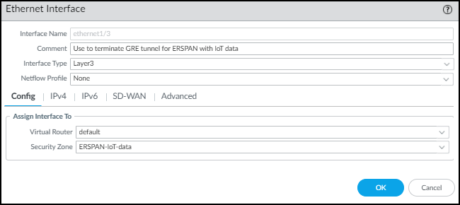 - Enter the following and leave the other settings at their default values:Comment: Enter a meaningful note about the interface for later reference.Interface Type: Layer3Virtual Router: Choose the virtual router you want to route to the interface. Consider using a separate virtual router exclusively for ERSPAN traffic.Security Zone: Choose the zone you just created.