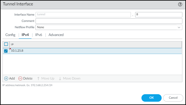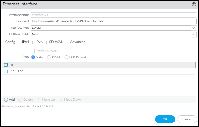 Create a Layer 3 interface and bind it to the zone you just created.- Select NetworkInterfacesEthernet and then click the Ethernet interface on which you want to terminate the GRE tunnel from the switch. Optionally, use a subinterface.