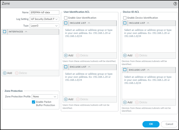 - Enter the following and leave the other settings at their default values:Name: Enter a meaningful name for the zone such as ERSPAN-IoT-data.Log Setting: Select IoT Security Default Profile or another log forwarding profile that sends the required types of logs to the logging service for Device Security.You must already have logging services enabled on the firewall.Type: Layer3