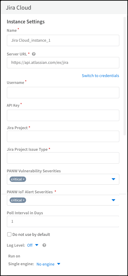 - Click the active integration instance settings icon, or click Add instance, to open the settings panel.Enter the following settings and leave the others at their default values:Name: Use the default name or enter a new one to help you identify the instance.Server URL: Enter the URL of your Jira Cloud server.Username: Enter your username for Jira Cloud.API Key: Enter the API token that you generated for Atlassian.Jira Project: Enter the full name for the Jira project where you want to create tickets, not the project code. This field is case-sensitive, and you can only input one project name.Jira Project Issue Type: Enter the issue type for issues that Device Security sends to Jira Cloud. You can only input one issue type, and this field is case-sensitive.Optional PANW Vulnerability Severities: Select the severity levels for open vulnerabilities that you want to send from Device Security to Jira Cloud. By default, Device Security sends only vulnerabilities with a severity level of Critical.PANW IoT Alert Severities: Select the severity levels for open alerts that you want to send from Device Security to Jira. By default, Device Security sends only alerts with a severity level of Critical.Optional Poll Interval in Days: Enter the time range, in days, that you want to poll for active alerts and vulnerabilities in Device Security to send to Jira Cloud. The default polling interval is one day.