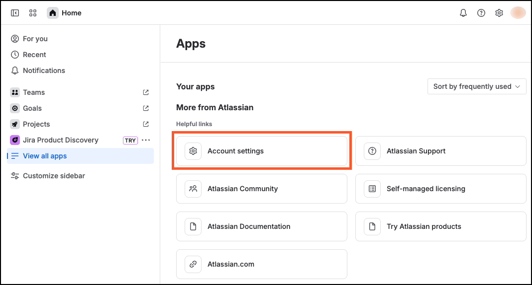 1. Log in to your Atlassian account and access View all appsAccount settings to open the account settings page.