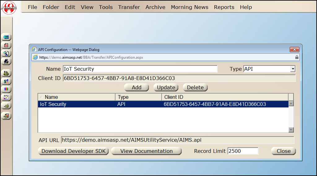 1. Log in to the AIMS system and click TransferAPI Configuration.