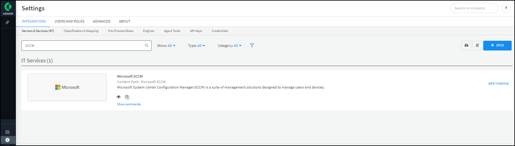 - If necessary, click SettingsIntegrationsServers & Services and search for sccm in the Settings section to locate it among other instances.