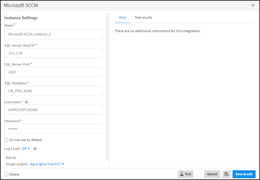 - Enter the following and leave the other settings at their default values:Name: Use the default name of the instance or enter a new one.SQL Server Host/IP: Enter the domain name or IP address of the SCCM SQL server.SQL Server Port: Enter the default TCP port number 1433 or, if a different port number is set on the SQL server, enter that.SQL Database: Enter the name of the database from which you want XSOAR to retrieve device information.Each integration instance can retrieve device information from a single database. If you want to retrieve device information from other databases, you must create additional integration instances for them.Username: Enter the name of the user account you previously configured in the SCCM SQL server.Password: Enter the password associated with the user account.Run on Single engine: Choose the XSOAR engine that you want to communicate with the SCCM SQL server.