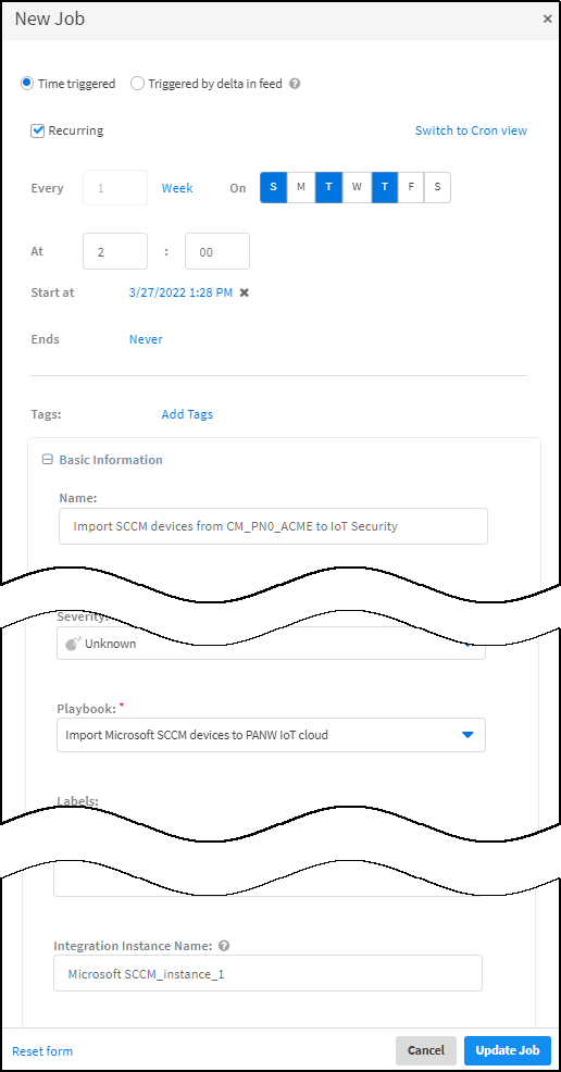 - In the New Job panel that appears, enter the following and leave the other settings at their default values:Time triggered: (select)Recurring: Select this because you want to periodically import device information from SCCM.Every: Enter a number and set the interval value (Minutes, Hours, Days, or Weeks) and select the days and times on which to run the job. This determines how often and when XSOAR retrieves data from SCCM. Consider running the job every day or every other day at a time when network activity is light, such as late at night, to help reduce potential latency. As a general guideline, it takes approximately 20 minutes for XSOAR to import data for 10,000 devices into Device Security. You can see the run status of a recurring job on the Jobs page and note how long it takes. When in progress, its status is Running. When done, its status changes to Completed.Name: Enter a name for the job.Playbook: Choose Import Microsoft SCCM devices to PANW IoT cloud.Integration Instance Name: Paste the name of the integration instance that you copied earlier.
