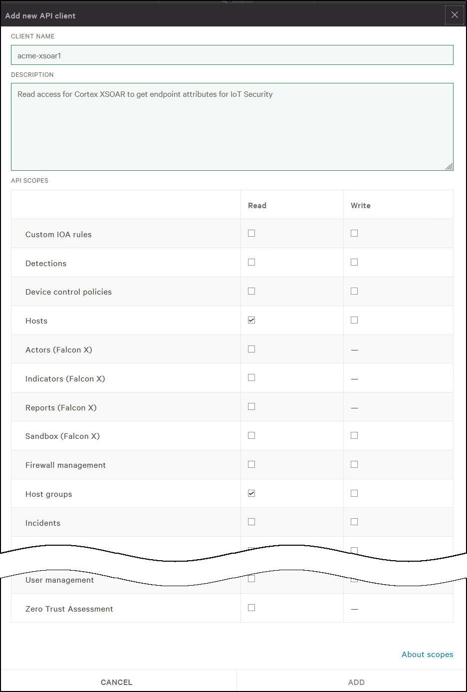 API Scopes: Select the following check boxes to allow read-only access to the API so that Cortex XSOAR can retrieve device attributes from CrowdStrike.