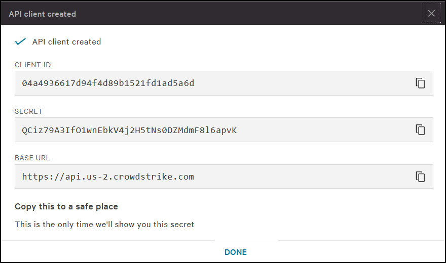 When you click Add, a panel appears with the client ID, secret, and base URL that Cortex XSOAR needs to access the API of the CrowdStrike cloud server.