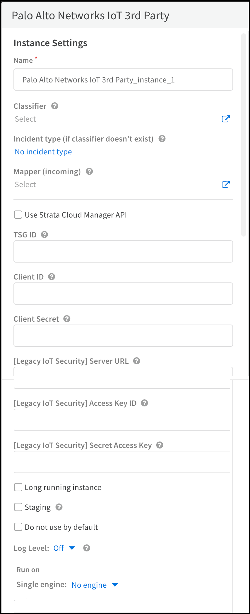 - Enter the following and leave other settings at their default values:Name: Use the default name ( Palo Alto Networks IoT 3rd Party_instance_1 ) or enter a new one.[Legacy IoT Security] Server URL : Copy this from the Integrations page in Device Security and paste it here.[Legacy IoT Security] Access Key ID: Copy this from the API access key file you downloaded and paste it here.[Legacy IoT Security] Secret Access Key: Copy this from the API access key file you downloaded and paste it here.Long running instance : (select; this maintains a session between the XSOAR server and Device Security, using a regular heartbeat mechanism to monitor connectivity)Single engine: Choose No engine.