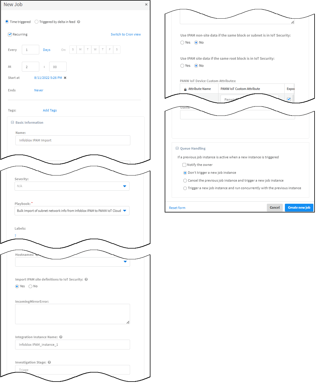 - In the New Job panel that appears, enter the following and leave the other settings at their default values:Time triggered: (select)Recurring: Select this if you want to periodically import the Infoblox Grid Master for IPAM data. Leave it unselected to run the bulk data import job manually.Every: If you select Recurring, enter a number and set the interval value (Minutes, Hours, Days, or Weeks) and select the days or time of day to run the job. (If you don’t select specific days, then the job will run everyday by default.) This determines how often and when XSOAR queries the Infoblox Grid Master. For example: 1 day and 2:00Name: Enter a name for the job.Playbook: Choose Bulk Import of subnet network info from Infoblox IPAM to PANW IoT Cloud.Import IPAM site definitions to Device Security: Select Yes to import site definitions along with subnets from Infoblox IPAM into Device Security. Select No to import subnets without any site data.Integration Instance Name: Paste the instance name you copied a few moments ago.Use IPAM non-site data if the same block or subnet is in Device Security: Non-site data for an IP block or subnet consists of its VLAN and description. Select Yes if you want Infoblox non-site data to overwrite Device Security data when there are matching IP blocks and subnets. Select No if you don’t want Infoblox non-site data to overwrite Device Security data.Use IPAM site data if the same root block is in Device Security: Select Yes if you want the site data of a root IP block in Infoblox IPAM to overwrite site data for a matching root IP block in Device Security. Because child and grandchild IP blocks and subnets inherit their site from the root IP block that’s their parent or grandparent, the root block site is the one that decides the site for itself and all those below it. Select No if you don’t want Infoblox site data to overwrite Device Security site data for a matching root IP block.![]()