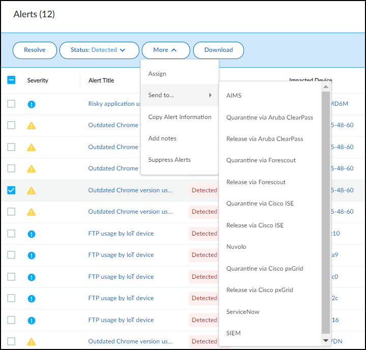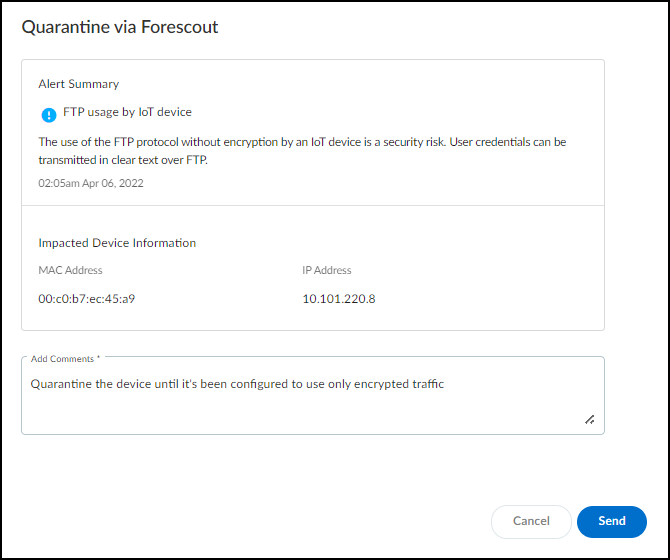 - Select an alert on AlertsSecurity AlertsAll Alerts in the Device Security portal.Click MoreSend toQuarantine via Forescout.