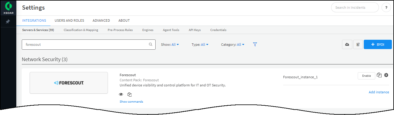 - Device Security uses Cortex XSOAR to integrate with Forescout, and the settings you must configure to integrate with it are in the XSOAR interface. To access these settings, click Launch Cortex XSOAR.The Cortex XSOAR interface opens in a new browser window.