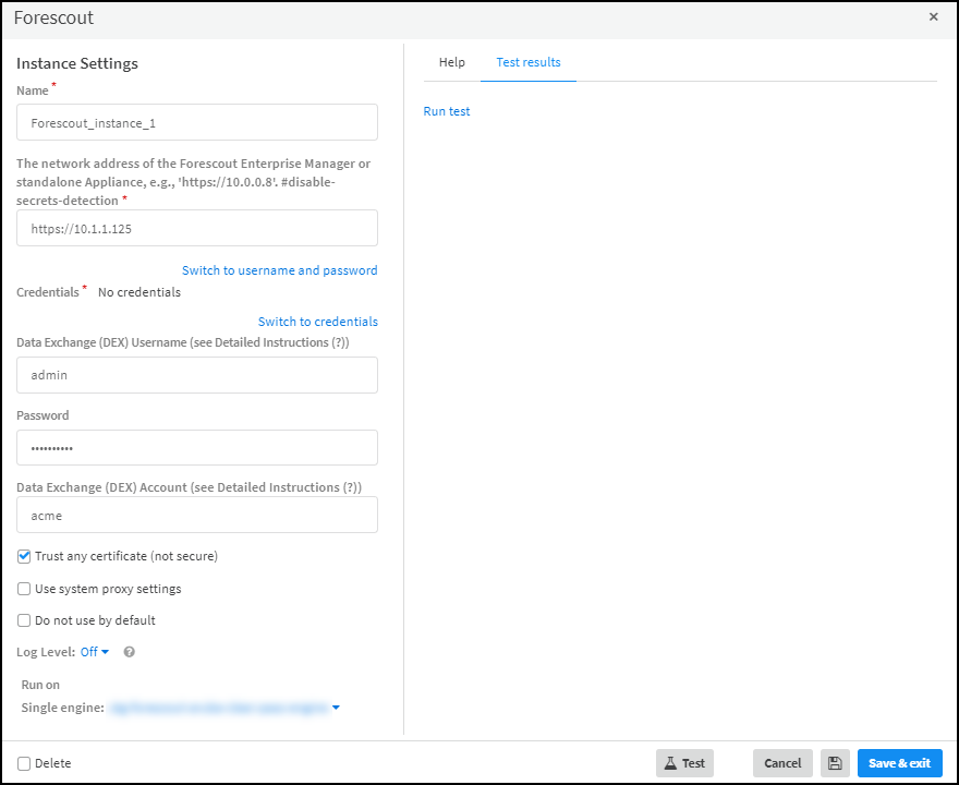 Create an integration instance for Forescout.- Click Add instance, configure the following, and leave the other settings at their default values:Name: Enter a name for the instance. Example: Forescout_instance_1Remember the instance name because you are going to use it again when creating a job that Cortex XSOAR will run.Network address: Enter the IP address or domain name of the Forescout Enterprise Manager or standalone appliance. Example: https://10.1.1.125Data Exchange (DEX) Username: Enter the username of the account that the XSOAR engine uses to log in to the Forescout application.Password: Enter the password for the account.DEX Exchange (DEX) Account: Enter the name of the DEX account you configured in Forescout.Use single engine: Choose the XSOAR engine that you installed previously.