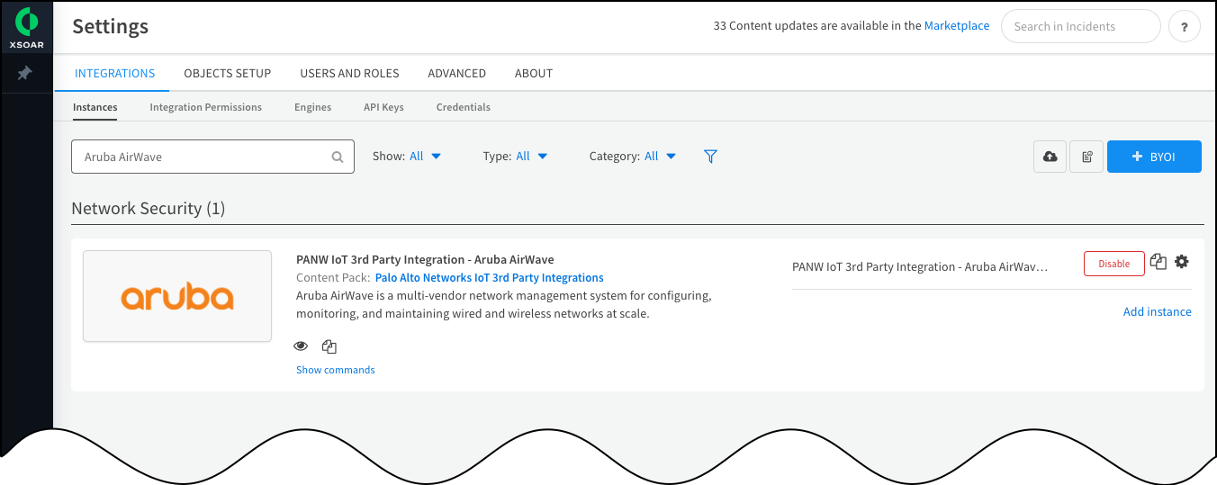 - Log in to Device Security and then click Integrations.Launch Cortex XSOAR from the Device Security portal.Device Security uses Cortex XSOAR to integrate with Aruba AirWave. The settings you must configure are in the Cortex XSOAR interface. To access these settings from the Integrations page, Launch Cortex XSOAR. The Cortex XSOAR interface opens in a new browser tab or window.Find the Aruba AirWave integration.Click Settings in the left navigation menu. Search for Aruba AirWave to locate it among other integrations.