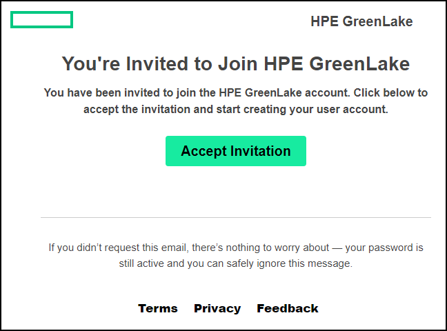 Hewlett Packard sends an HPE Cloud Signup Invite to the email address. - When the recipient receives the email message, he or she clicks Accept Invitation.