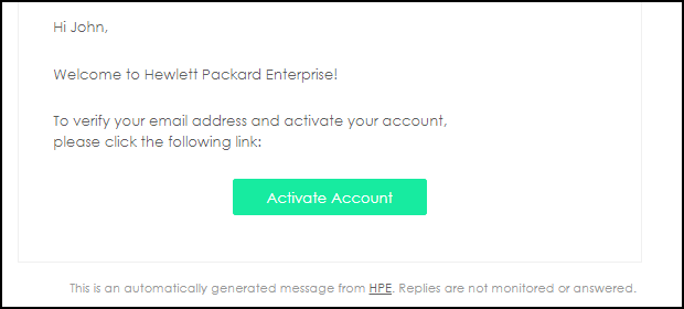 The link opens a webpage where the person can create an HPE account. - The user enters an email address, password, first name, and last name; accepts the HPE terms of use; and then clicks Register.The user must share the password with you so you can enter it and the user’s email address (as a username) when configuring an Aruba Central integration instance in Cortex XSOAR later.Hewlett Packard sends a verification email to the email address.