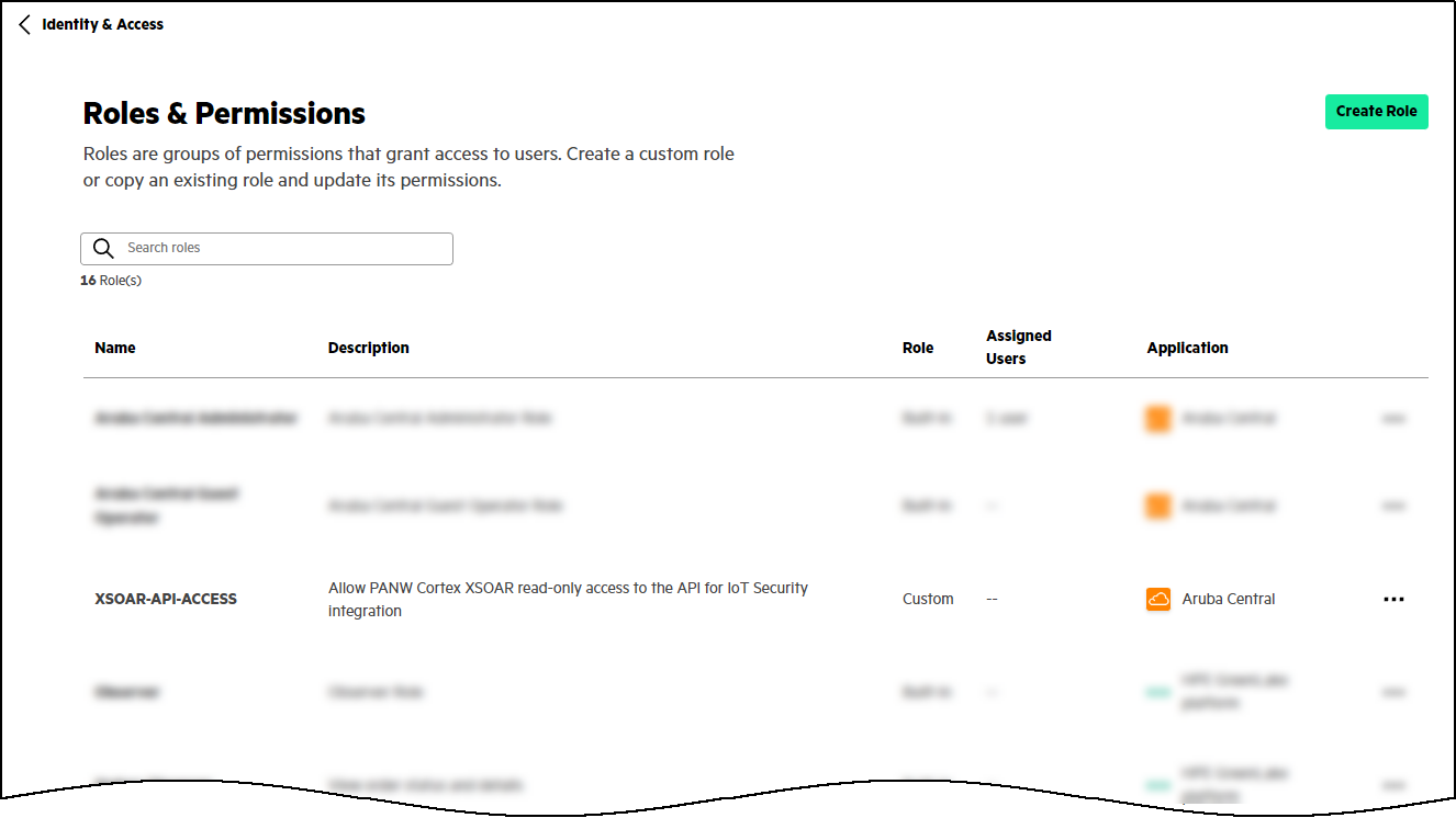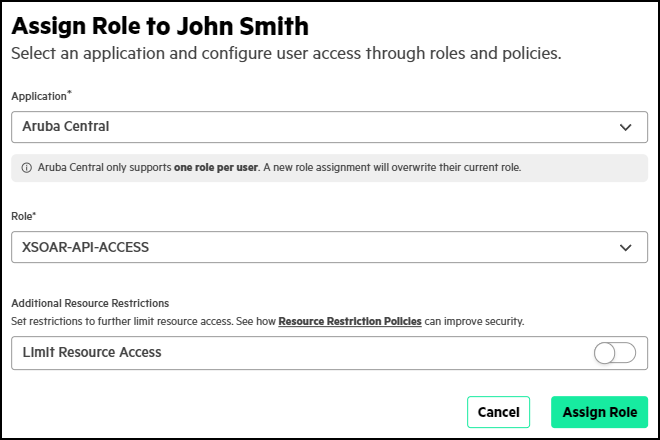 - Choose Aruba Central for Application and XSOAR-API-ACCESS for Role and then click Assign Role.