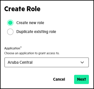 - Select Create new role, choose Aruba Central, and then click Next to launch a role creation wizard.