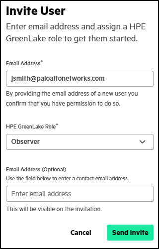 - Enter an email address and choose an HPE GreenLake Role such as Observer.The user account will not be used to access HPE GreenLake; however, you must assign an HPE GreenLake role first so that once the user account is created and activated, you can assign it the read-only role you created for it when accessing the Aruba Central application.