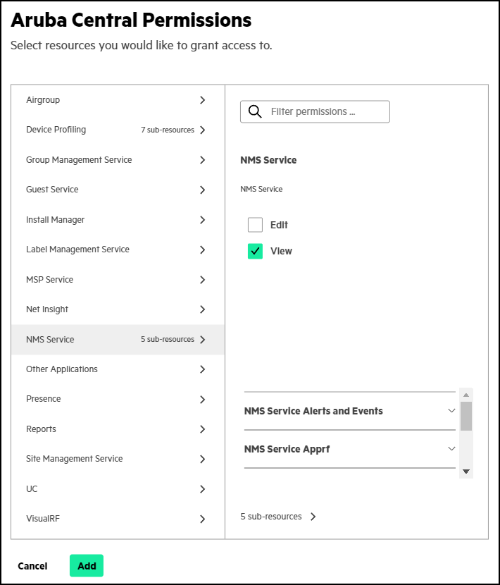 - Click Add Permissions, select NMS Service, select View, and then click Add.