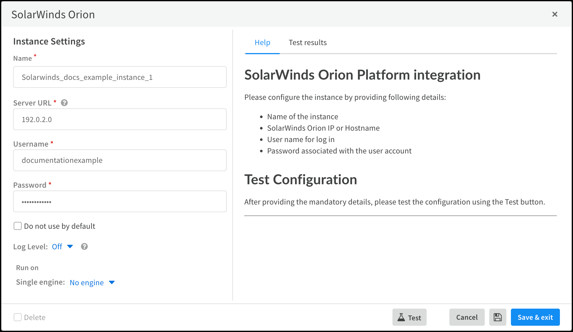 - Optional Run on Single engine: Choose the Cortex XSOAR engine you want to use if you're connecting to an on-premises SolarWinds Platform.