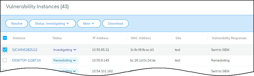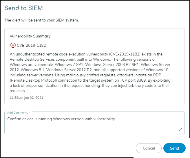 - Select a vulnerability to investigate.Log in to the Device Security portal, click VulnerabilitiesVulnerability OverviewAll Vulnerabilities, click a vulnerability name, and then select the check box of an active instance that you want to investigate.The Send to SIEM panel appears.