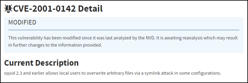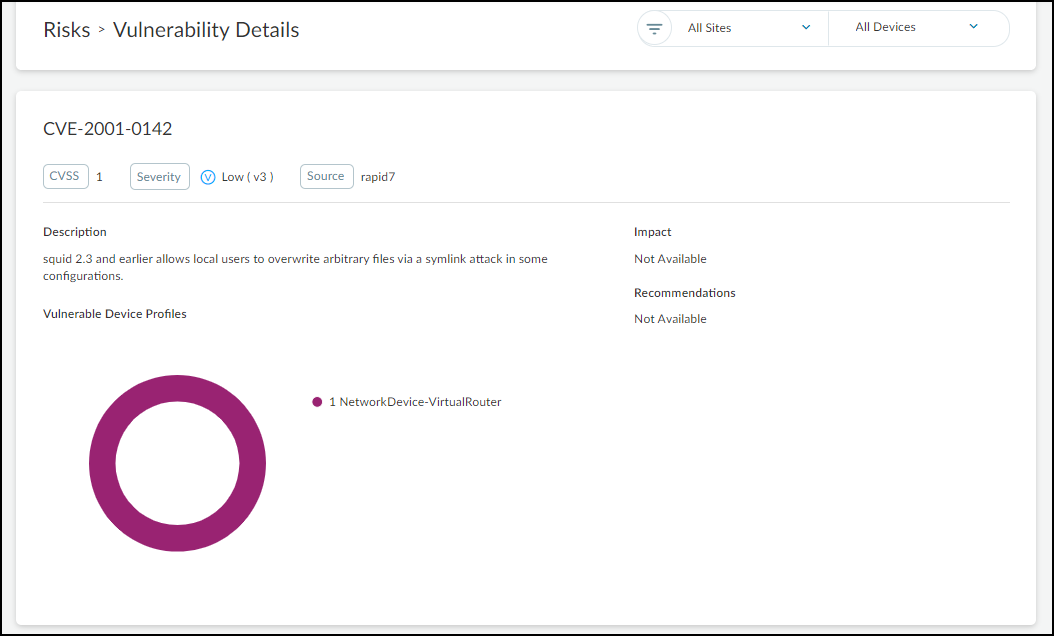 Click Scan.Depending on the type of scan you choose, it can take anywhere from a few minutes to half an hour, and sometimes even longer. However, it’s common for scans to take 20-30 minutes. If there is an issue, such as the scanner being unable to reach the target device, the effort eventually times out after two hours.After Rapid7 completes the scan, it reports back to Device Security. If there are any discovered Common Vulnerabilities and Exposures (CVEs), IoT Security immediately updates the risk score and CVEs on the Device Details page. Updates to the CVEs on the RisksVulnerabilities page are not made immediately and can take up to 24 hours to appear. Rapid7 provides Device Security with the vulnerability CVE ID number, severity level (CVSS), and service port number. Device Security retrieves a description for the CVE from the National Institute of Standards and Technology (NIST) website. For example, the description for CVE-2001-0142 comes from this NIST page.