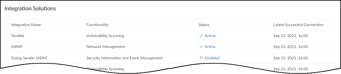 Click Create new job and verify that the job appears in the Jobs list.Enable the job and run it.Check the Job Status for the job you created. If it's Disabled, select its checkbox and then click Enable.You can immediately run the job by selecting it and clicking Run now. Otherwise, if you scheduled a recurring job, then the enabled job will run as scheduled.Return to Device Security and check the status of the Tenable integration instance.XSOAR automatically runs a preconfigured job for Tenable integration and reports the integration instance to Device Security, which displays it on the Integrations page. The integration instance can be in one of the following four states as shown in the Status column on the Integrations page:- Disabled means that either the integration was configured but intentionally disabled or it was never configured and a job that references it is enabled and running.