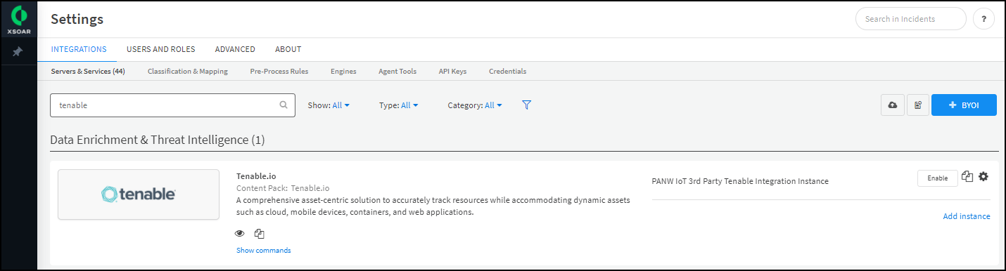 - Click Settings in the left navigation menu, and search for Tenable to locate it among other instances.