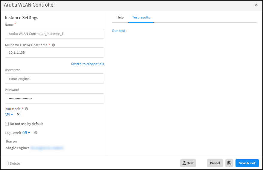 - Enter the following settings:Name: Use the default name (Aruba WLAN Controller_instance_1) of the instance or enter a new one.Aruba WLC IP or Hostname: Enter the IP address or hostname of the wireless controller. You can prepend https:// to the IP address or hostname or omit it. These, for example, are all acceptable: https://10.1.1.25 or 10.1.1.25, and https://wlc1.acme.com or wlc.acme.com.Username: Type the name of the user account that you previously created for the XSOAR engine to use when connecting to the WLAN controller.Password: Type the password associated with the user account.Run Mode: APIRun on Single engine: Choose the XSOAR engine that you want to communicate with this Aruba WLAN controller.