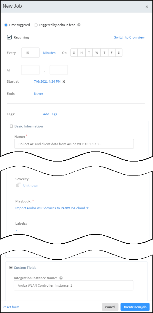 - In the New Job panel that appears, enter the following and leave the other settings at their default values:Recurring: Select this because you want to periodically poll the controller for device details.Every: Enter a number and set the interval value (Minutes, Hours, Days, or Weeks) and select the days on which to run the job. (If you don’t select specific days, then the job will run everyday by default.) This determines how often XSOAR queries the controller for details about its active devices. For example: 15 minutes.Name: Enter a name for the job.Playbook: Choose Import Aruba WLC devices to PANW IoT cloud.Integration Instance Name: Paste the instance name you copied a few moments ago.