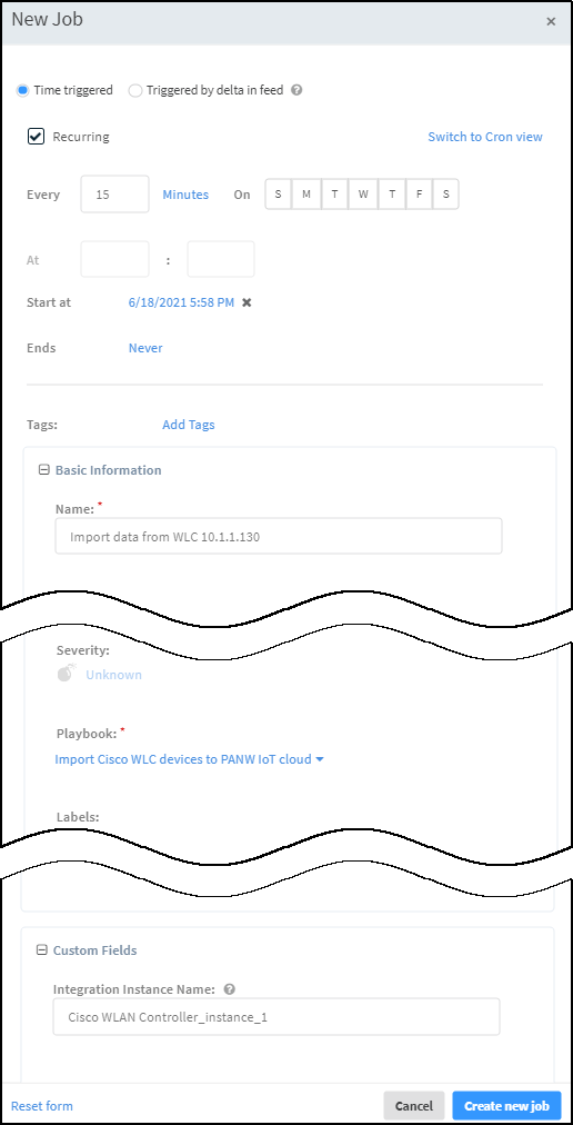- In the New Job panel that appears, enter the following and leave the other settings at their default values:Recurring: Select this because you want to periodically poll the controller for device details.Every: Enter a number and set the interval value (Minutes, Hours, Days, or Weeks) and select the days on which to run the job. This determines how often XSOAR queries the controller for details about active devices. For example: 15 minutes.Name: Enter a name for the job.Playbook: Choose Import Cisco WLC devices to PANW IoT cloud.Integration Instance Name: Paste the instance name you copied a few moments ago.